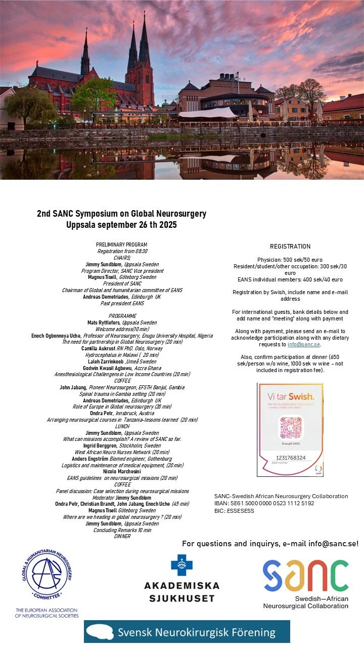Back to All Events Global neurosurgery symposium in Uppsala, Sweden September 26th 2025 Friday, September 26, 2025 8:00 AM 7:00 PM Google Calendar ICS In times of international instabiliy, collaborations are more important than ever. On September 26th 2025 , SANC will host the second SANC international symposium on Global Neurosurgery in Uppsala.